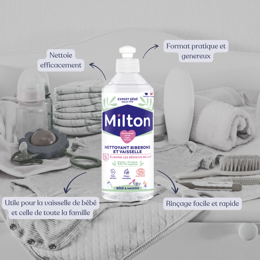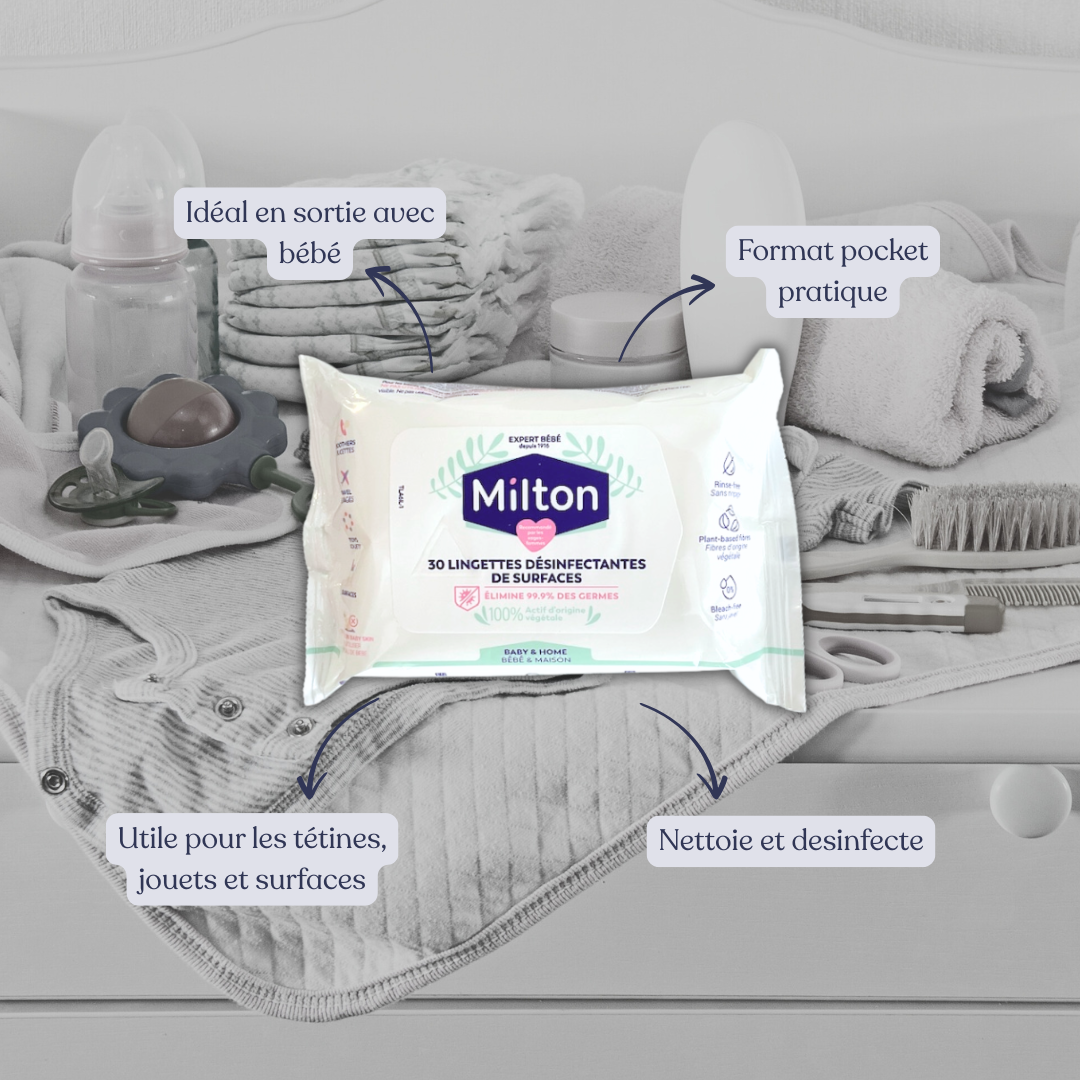 Ainsi que le nécessaire pour nettoyer efficacement l’environnement de bébé tel qu’un paquet de 30 lingettes de surfaces désinfectante qui élimine 99,9% des germes composé à 100% d’actif végétale pratique à emporter partout, ainsi qu’un liquide vaisselle de 500 ml qui élimine efficacement les résidus de lait, d’origine 100% végétale de la marque Milton certifié AIR LABEL SCORE.