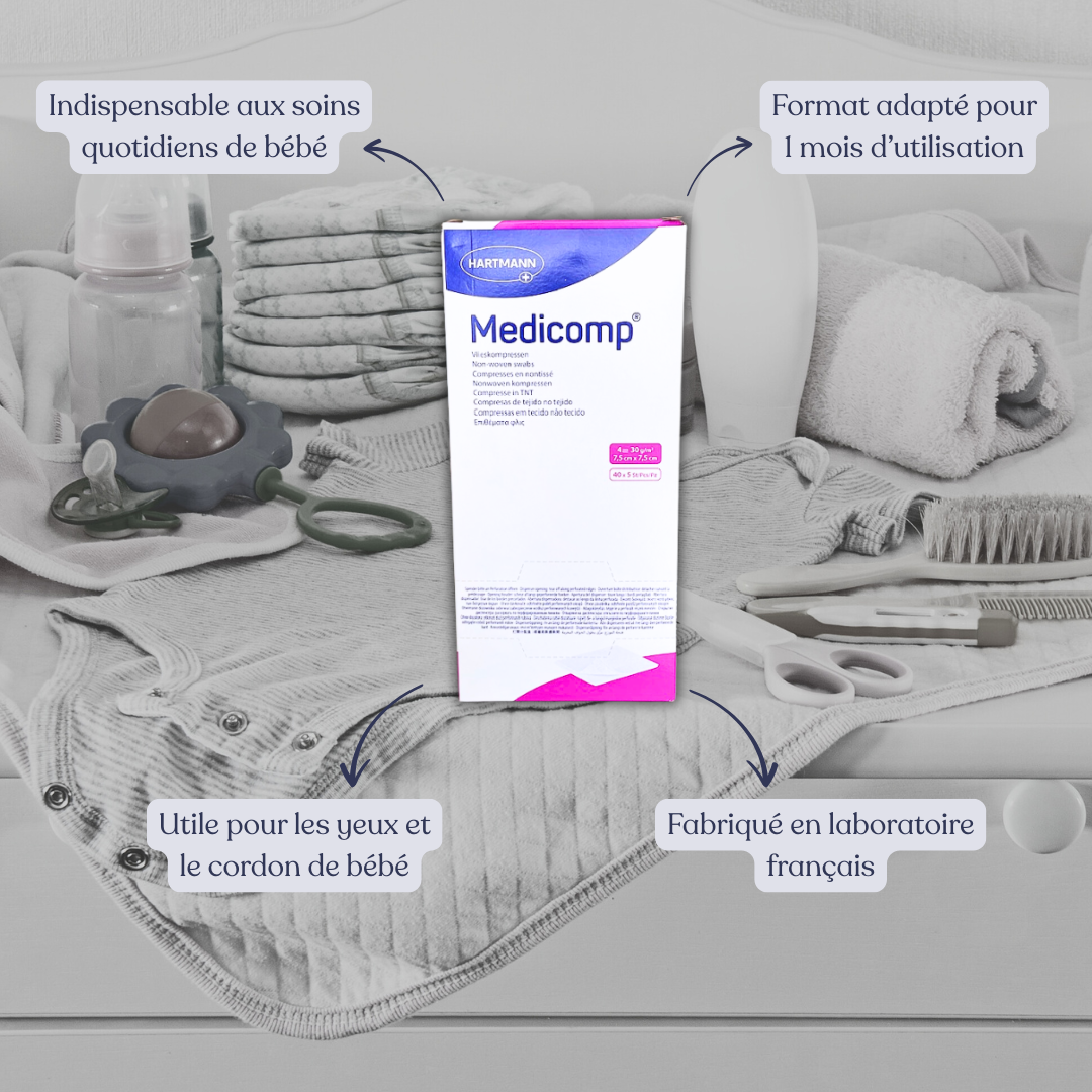 Ainsi qu’une boite de 40 paquets contenant chacun 5 compresses stériles non tissées, idéales pour le nettoyage du cordon, des yeux et des oreilles de bébé.