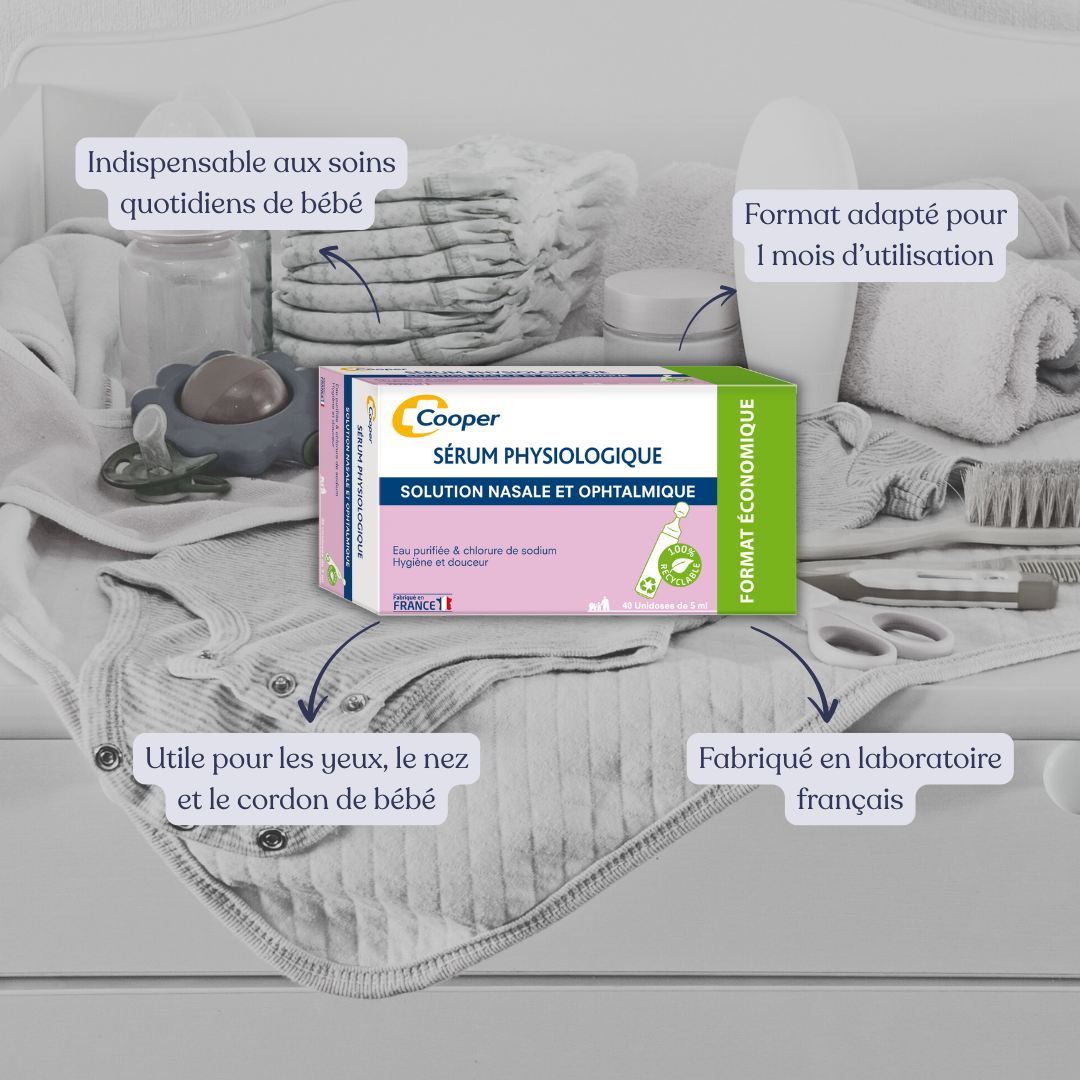 Cette box se compose d’une boite de 40 pipettes de sérum physiologique stérile nécessaire au nettoyage des yeux et du nez de bébé fabriqué par le laboratoire Cooper.