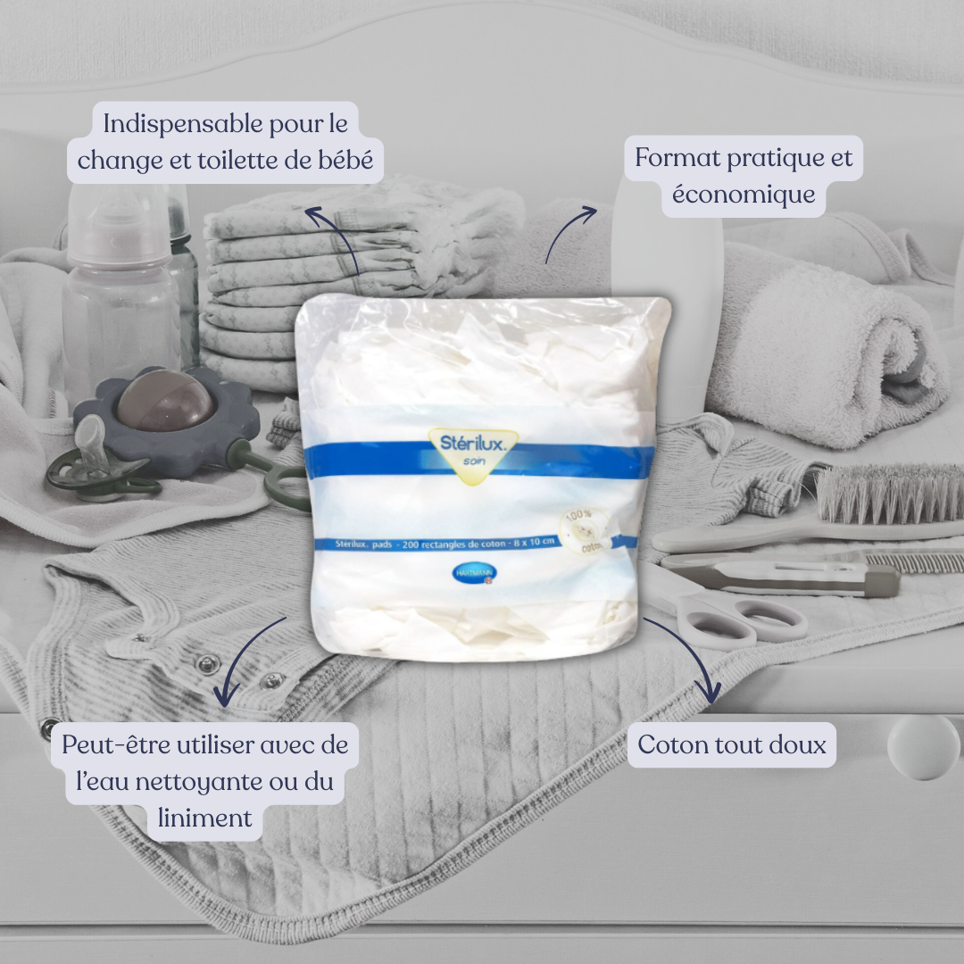 Vous y trouverez également 2 paquets de 200 cotons pads utiles pour le change, le nettoyage du visage et des mains de bébé fabriqués par le laboratoire Hartmann.