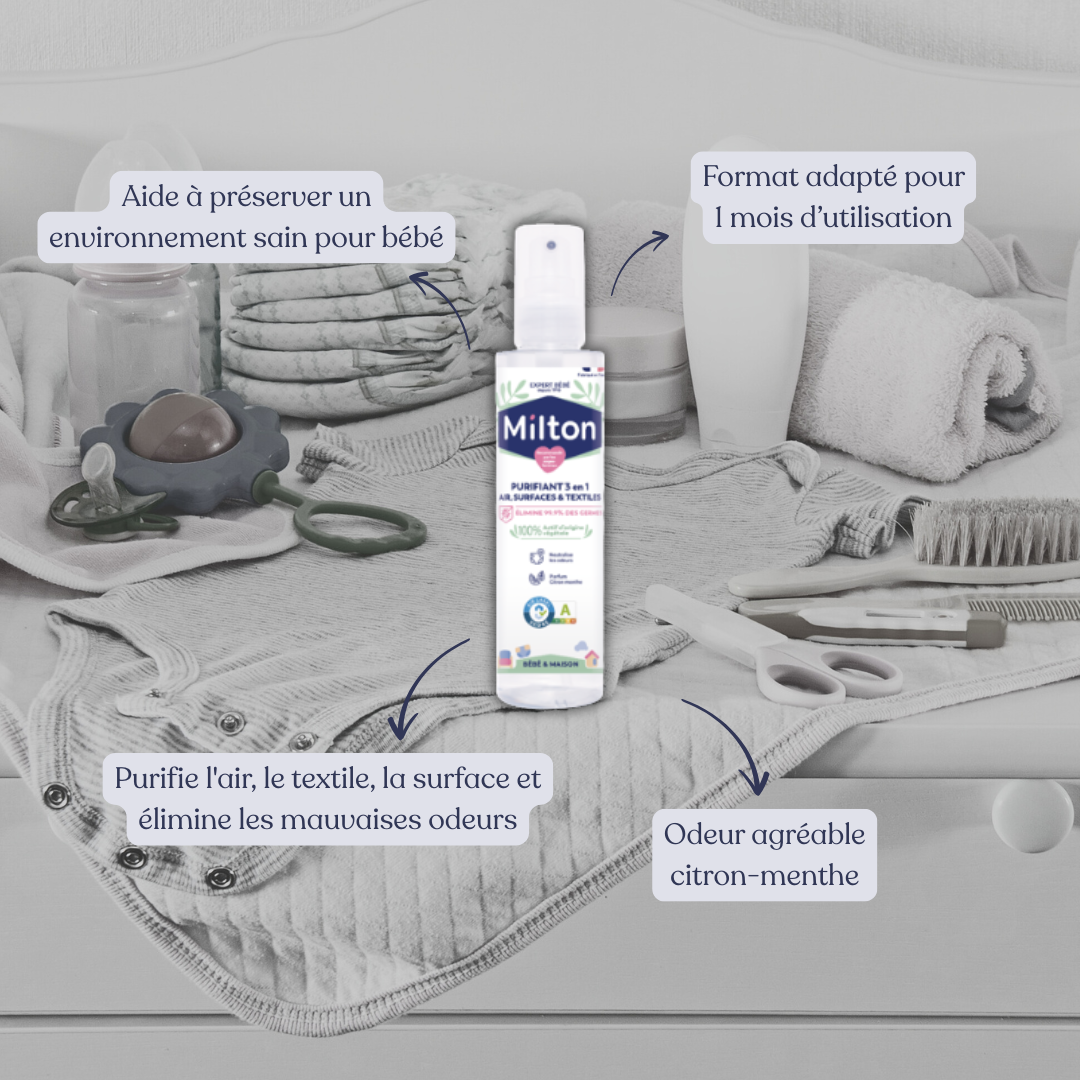 Et pour finir une gamme complète de la marque Milton, vous permettant de nettoyer efficacement l’environnement de bébé grâce au paquet de 30 lingettes de surfaces désinfectantes qui élimine 99,9% des germes composé 100% d’actif végétale à emporter partout, d’un liquide vaisselle de 500 ml qui élimine efficacement les résidus de lait, d’origine 100% végétale, ainsi qu’un spray 3en1 purifiant senteur citron-menthe aux actifs 100% végétale vous permettant de désinfecter les textiles, les surfaces et assainir l’air.